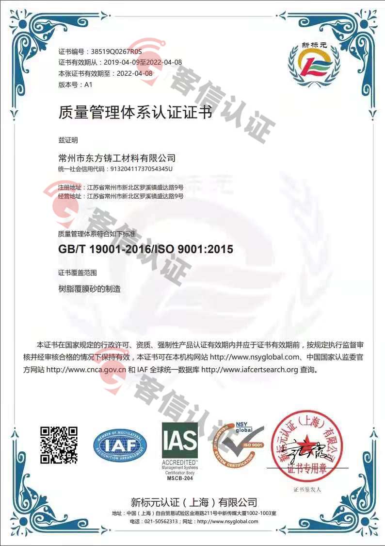 恭喜常州市東方鑄工材料有限公司獲取ISO9000證書