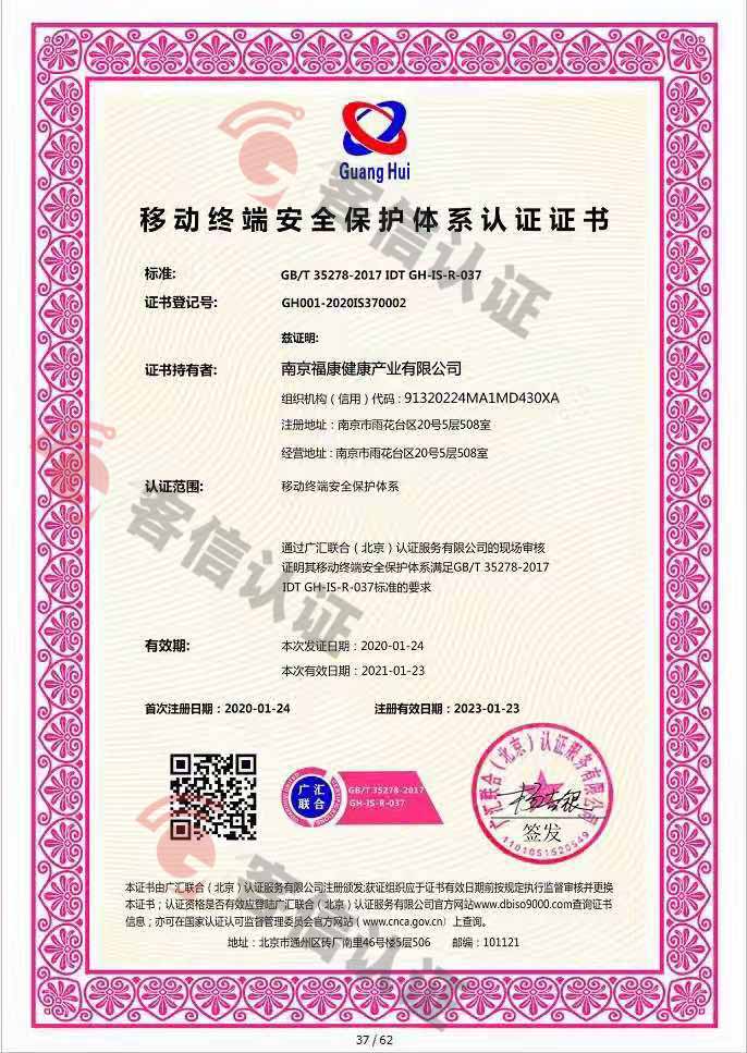 恭喜南京福康通健康產(chǎn)業(yè)有限公司獲取移動(dòng)終端安全保護(hù)體系認(rèn)證