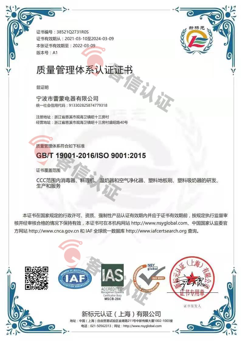 > 恭喜寧波市蕾蒙電器有限公司獲取ISO9000管理體系證書