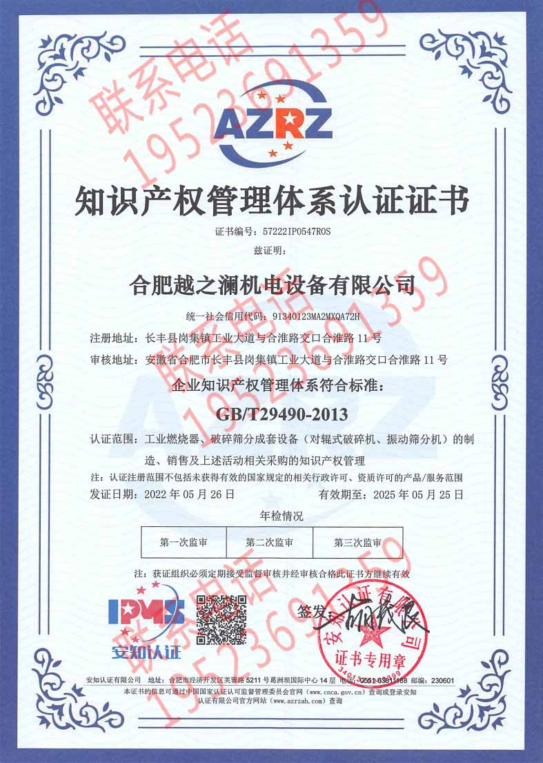 恭喜合肥越之瀾機械設(shè)備有限公司獲得知識產(chǎn)權(quán)認證證書