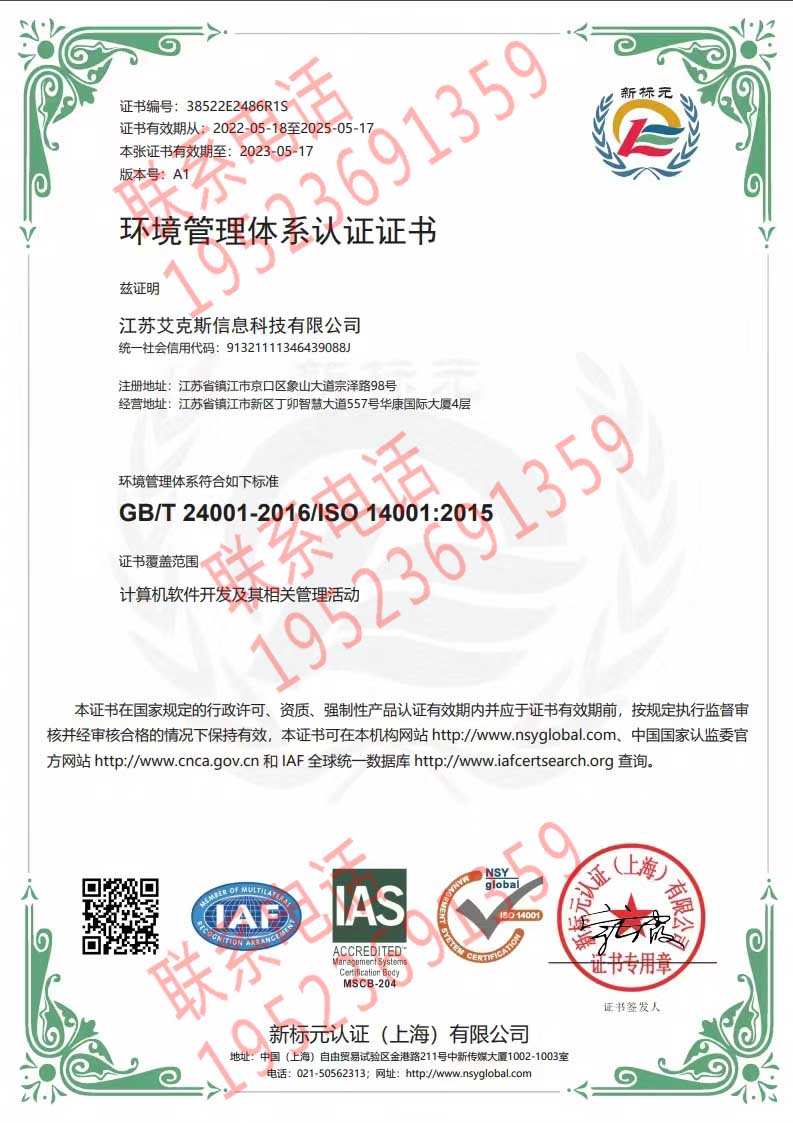 > 恭喜江蘇艾克斯信息科技有限公司獲得ISO14000和ISO45000體系認(rèn)證證書